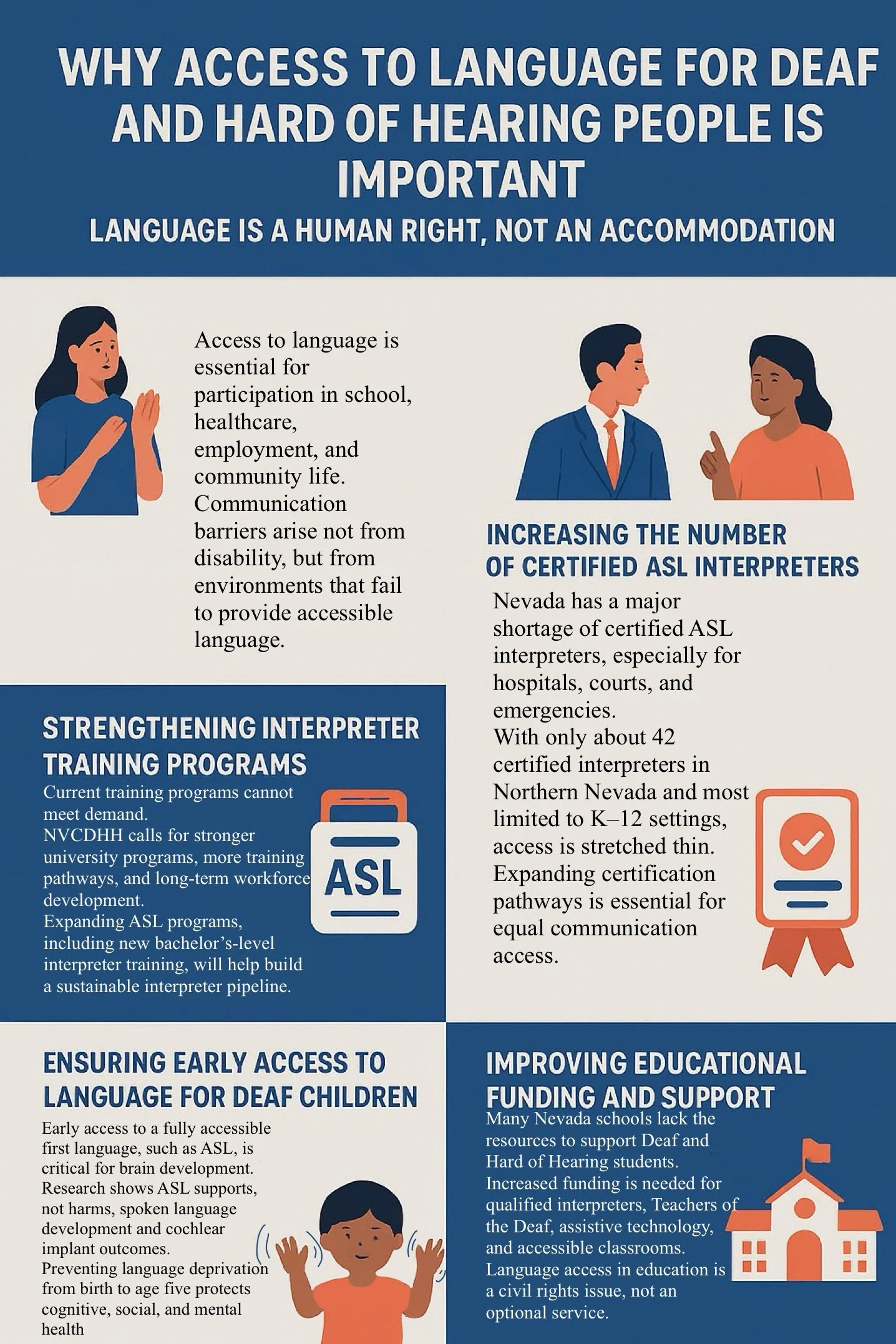 Recognizing the seriousness of the issue, the Nevada Commission for Persons Who Are Deaf and Hard of Hearing (NVCDHH) recently issued new position statements calling for urgent action. Since its establishment in 2007, the Commission has worked to ensure equal access for Deaf, Hard of Hearing, DeafBlind, DeafPlus, and speech-impaired Nevadans. Its latest recommendations push for expanded interpreter access, stronger educational systems, and early intervention to prevent language deprivation before it begins.