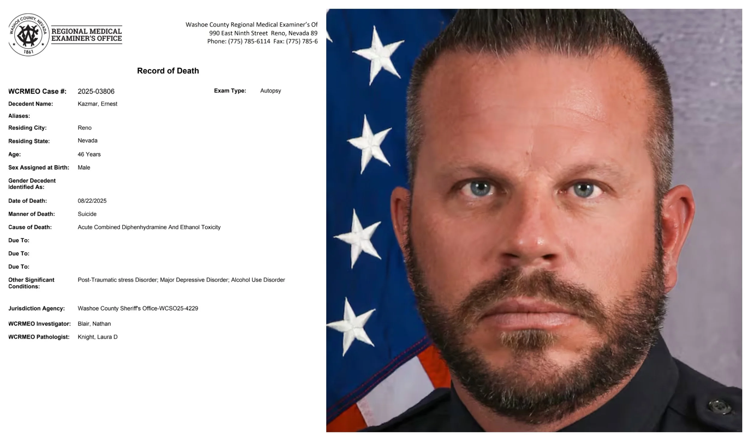 The Washoe County Coroner’s Office sent a record of death to Our Town Reno today indicating the late Reno Police Sergeant Ernest Kazmar who was found dead at the age of 46 on August 22nd on the 6100 block of Lakeside Drive died from suicide.