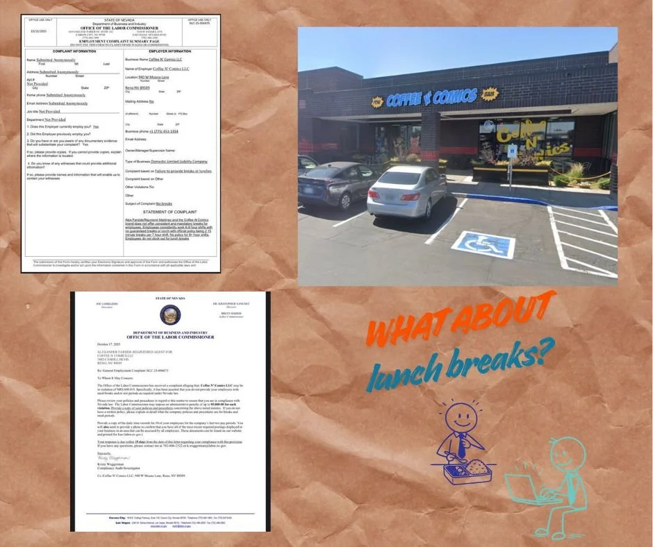 A Department of Business and Industry Office of the Labor Commissioner document from last month forwarded to Our Town Reno indicates it received a complaint alleging that Coffee N’ Comics on Moana Lane may have been in violation of a statute requiring businesses to provide employees with “meal breaks and or rest periods as required under Nevada law.”