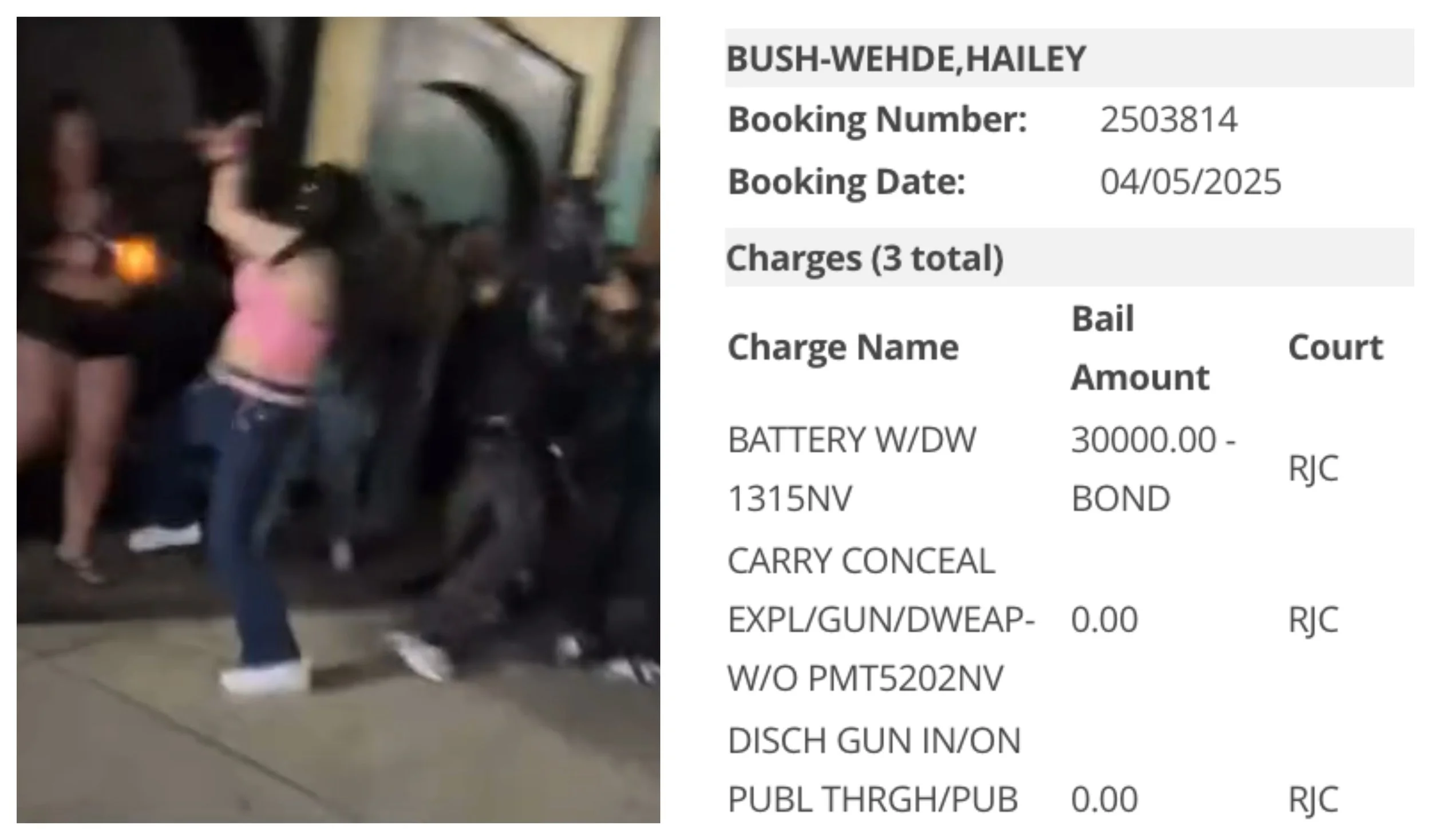 Hailey Bush-Wehde is still listed as an inmate at the Washoe County jail tonight with a $30,000 bond after being booked yesterday on charges of battery with a deadly weapon, carrying a concealed weapon without a valid permit and discharging a gun in a public place, in connection with shots fired during an altercation outside Club Two One Nine on 2nd street last month.