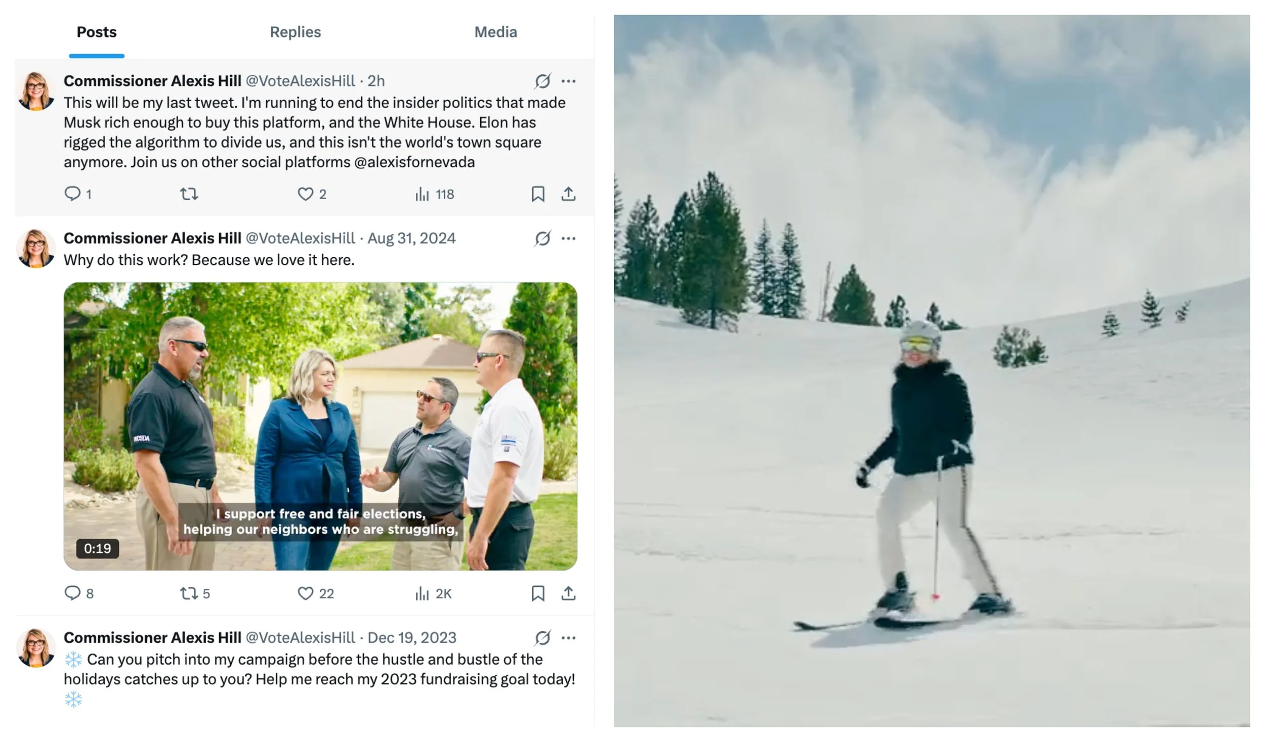 “This will be my last tweet. I'm running to end the insider politics that made [Elon] Musk rich enough to buy this platform, and the White House,” Commissioner Alexis Hill wrote on the X platform today while doing an all hands on deck official campaign kickoff.