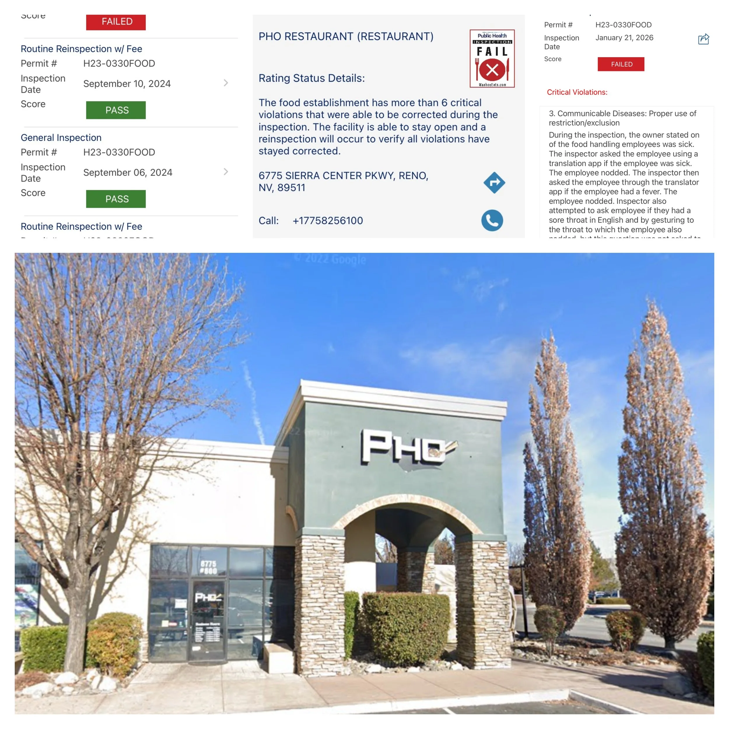 According to the Washoe Eats app, the Pho Restaurant at 6775 Sierra Center Parkway failed its most recent inspection in late January with moldy noodles, and one of its employees found to be working while sick, which prompted an agitated response from the establishment’s owner.