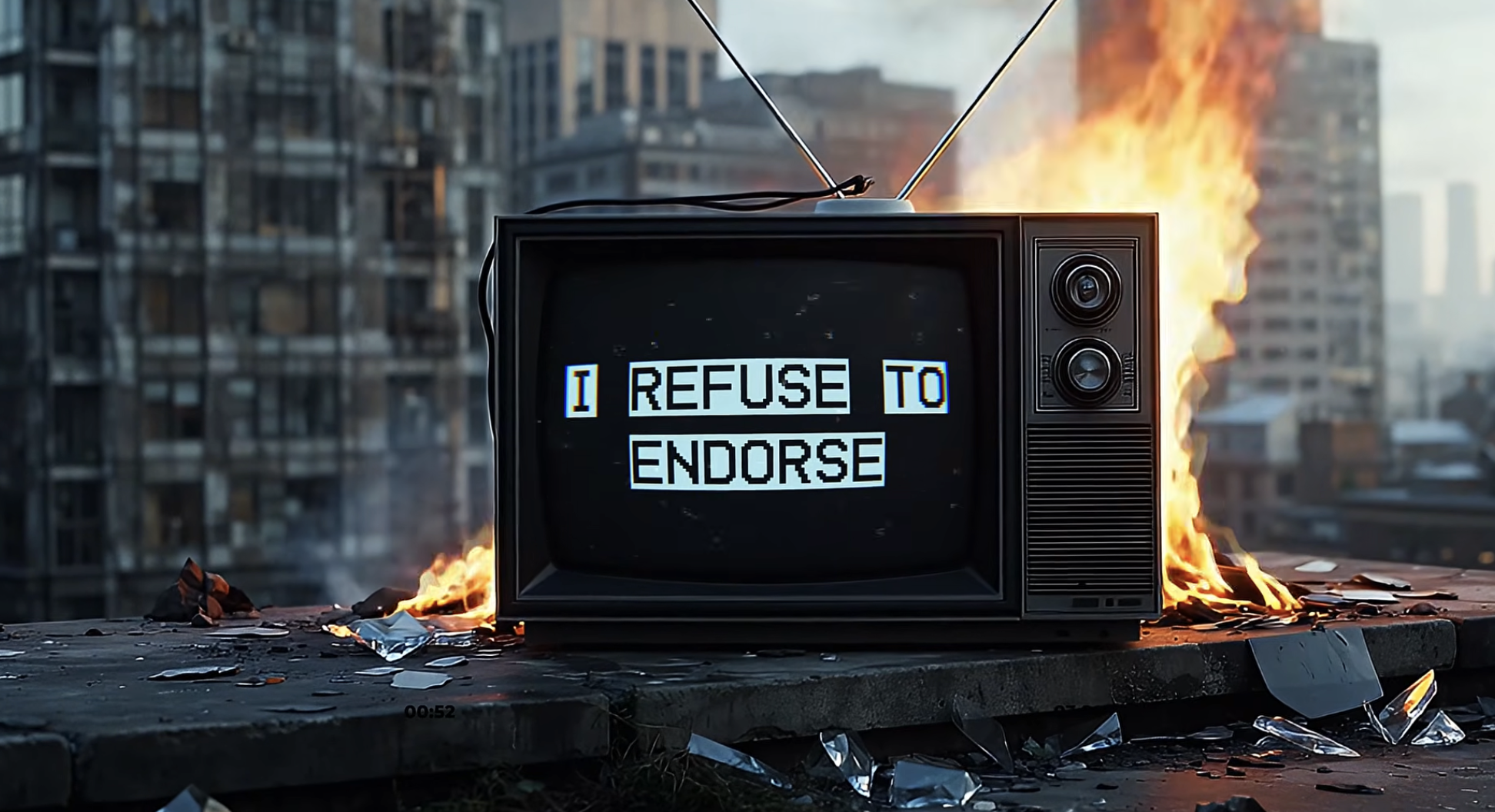 “Morality over Mercy,” the lyrics read on an old tv screen with a fire behind it in a video on YouTube for the No Kings song. “Punishment over Health. Punish the Poor. Prop Up Wealth. America’s Best Export is Just Lies. A pig in lipstick is the American Prize. You Cover Your Face But We Can See American Bootlickers Bend a Knee…”